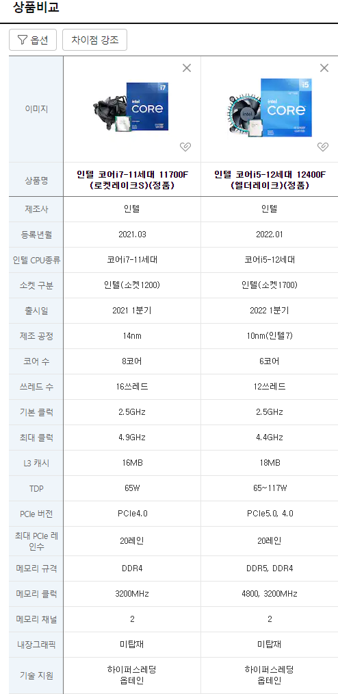 i7-11700(F, K, KF) 등 아래 세대는 고려 할 가치가 없음.